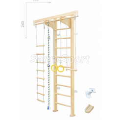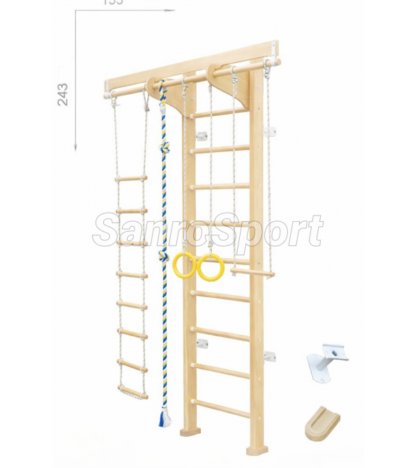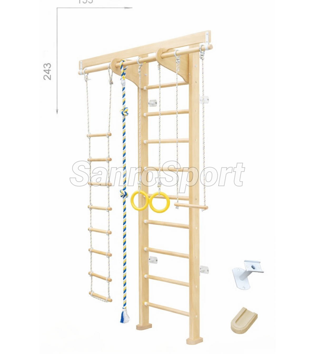 Прочная деревянная лестница позволит забраться на самую вершину шведской стенки и дотянуться до деревянного карниза с навесным оборудованием. По веревочной лестнице Ваш ребенок легко спустится вниз. Детские гимнастические кольца помогут укрепить мышцы рук. Гимнастические кольца - лучший спортивный снаряд, объединяющий возможности для развлечения и физического развития. Трапеция даст Вашему ребенку возможность раскачиваться в разные стороны.